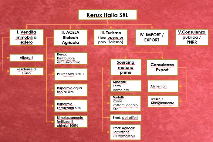 La mission in generale della Kerux Italia SRL e quella di fare da ponte tra la Campania e l’estero e contribuire a sostenere l’internazionalizzazione della zona nell’aprovigionamento, nelle esportazioni e nello sviluppo del turismo.